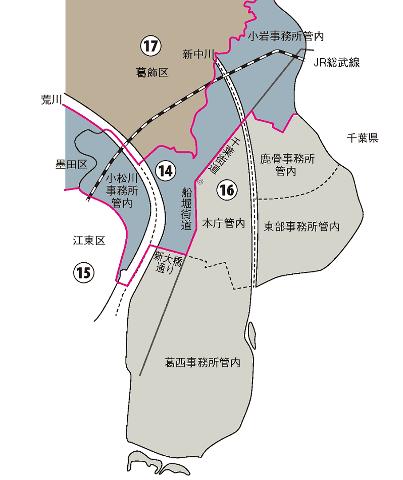 本庁管内 中央1丁目~3丁目、松江1丁目~7丁目、大杉1丁目~5丁目、西一之江1丁目~4丁目、春江町4丁目、一之江1丁目~8丁目、 西瑞江4丁目、江戸川4丁目、松本1丁目、松本2丁目 江戸川区葛西事務所管内 |