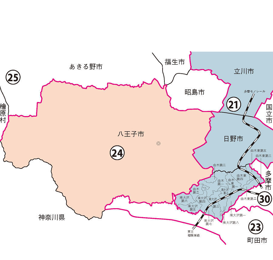第21区に属しない区域(以下の地域) 横山町、八日町、八幡町、八木町、追分町、千人町1丁目~4丁目、日吉町、元本郷町1丁目~4丁目、 平岡町、本郷町、大横町、本町、元横山町1丁目~3丁目、田町、新町、明神町1丁目~4丁目、 子安町1丁目~4丁目、東町、旭町、三崎町、中町、南町、寺町、万町、上野町、天神町、南新町、 小門町、台町1丁目~4丁目、中野町、暁町1丁目~3丁目、中野山王1丁目~3丁目、中野上町1丁目~5丁目、 大和田町1丁目~7丁目、富士見町、緑町、清川町、東浅川町、初沢町、高尾町、南浅川町、西浅川町、裏高尾町、廿里町、 中山(519 番地、523 番地から526 番地まで、819 番地から830 番地まで、842 番地、875 番地から878 番地まで、880 番地から1148 番地まで、1156 番地、1219 番地及び1221 番地に限る。)、 鑓水(339 番地から345 番地まで、364 番地から371 番地まで及び396 番地に限る。)、 並木町、散田町1丁目~5丁目、山田町、めじろ台1丁目~4丁目、長房町、城山手1丁目、城山手2丁目、 狭間町、椚田町、館町、寺田町、大船町、大楽寺町、上壱分方町、諏訪町、四谷町、叶谷町、泉町、横川町、 弐分方町、川町、元八王子町1丁目~3丁目、下恩方町、上恩方町、西寺方町、小津町、川口町、上川町、 犬目町、楢原町、美山町、尾崎町、左入町、滝山町1丁目、滝山町2丁目、梅坪町、谷野町、みつい台1丁目、 みつい台2丁目、丹木町1丁目~3丁目、加住町1丁目、加住町2丁目、宮下町、戸吹町、高月町、小比企町、 片倉町、西片倉1丁目~3丁目、宇津貫町、みなみ野1丁目~6丁目、兵衛1丁目、兵衛2丁目、 七国1丁目~6丁目、北野町、打越町、北野台1丁目~5丁目、長沼町、絹ケ丘1丁目~3丁目、高倉町、 石川町、宇津木町、平町、小宮町、久保山町1丁目、久保山町2丁目、大谷町、丸山町 |