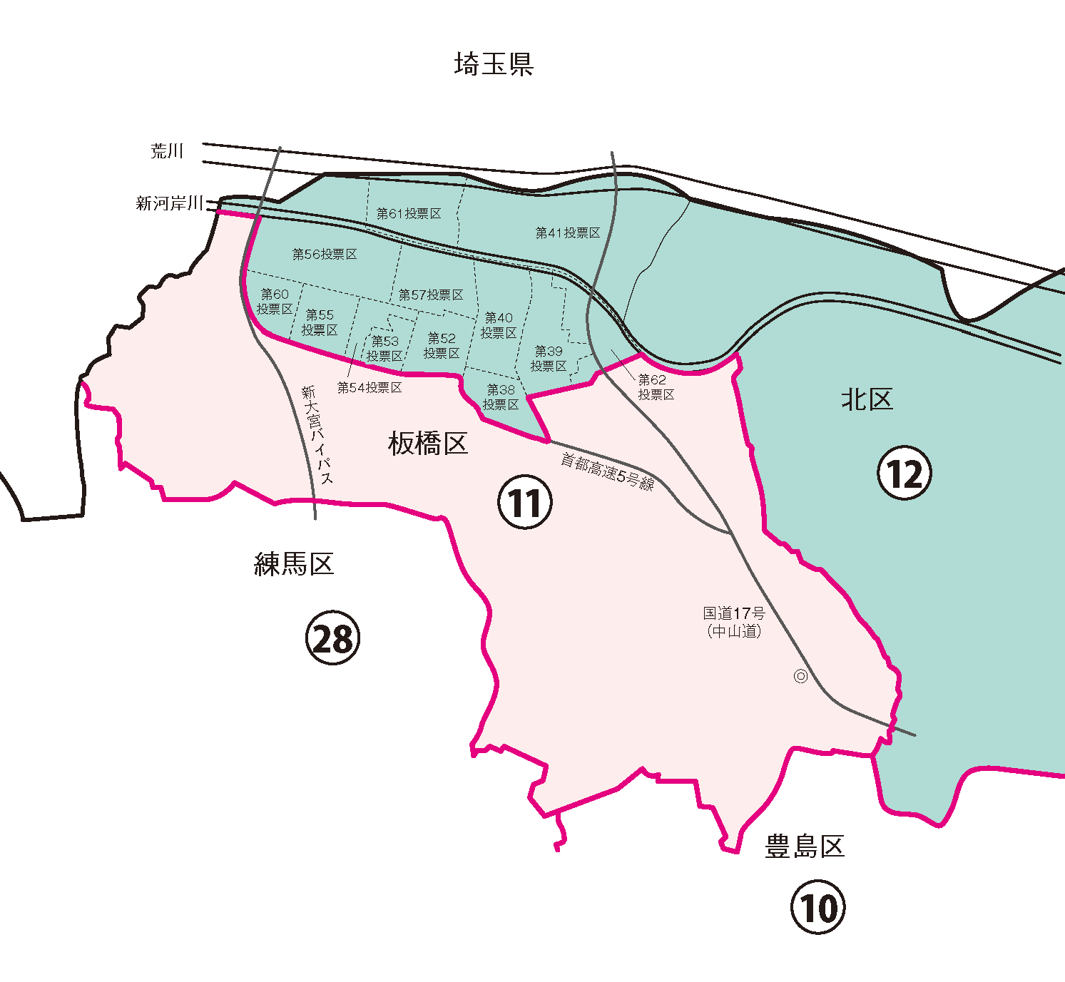 本庁管内 板橋1丁目~4丁目、加賀1丁目、加賀2丁目、大山東町、大山金井町、熊野町、中丸町、南町、稲荷台、仲宿、 氷川町、栄町、大山町、大山西町、幸町、中板橋、仲町、弥生町、本町、大和町、双葉町、富士見町、大谷口上町、 大谷口北町、大谷口1丁目、大谷口2丁目、向原1丁目~3丁目、小茂根1丁目~5丁目、常盤台1丁目~4丁目、 南常盤台1丁目、南常盤台2丁目、東新町1丁目、東新町2丁目、上板橋1丁目~3丁目、清水町、蓮沼町、大原町、 泉町、宮本町、志村1丁目~3丁目、坂下1丁目(1番から26番まで、28番)、東坂下1丁目、小豆沢1丁目~4丁目、 西台1丁目~4丁目(赤塚支所管内を除く)、中台1丁目~3丁目、若木1丁目~3丁目、前野町1丁目~6丁目、 三園2丁目、東山町、桜川1丁目~3丁目 東京都板橋区赤塚支所管内 西台2丁目(30番5号から30番16号まで、31番から40番まで)、西台3丁目(47番、55番から57番まで)、 徳丸1丁目~8丁目、四葉1丁目、四葉2丁目、大門、赤塚1丁目~8丁目、赤塚新町1丁目~3丁目、成増1丁目~5丁目、 三園1丁目 |