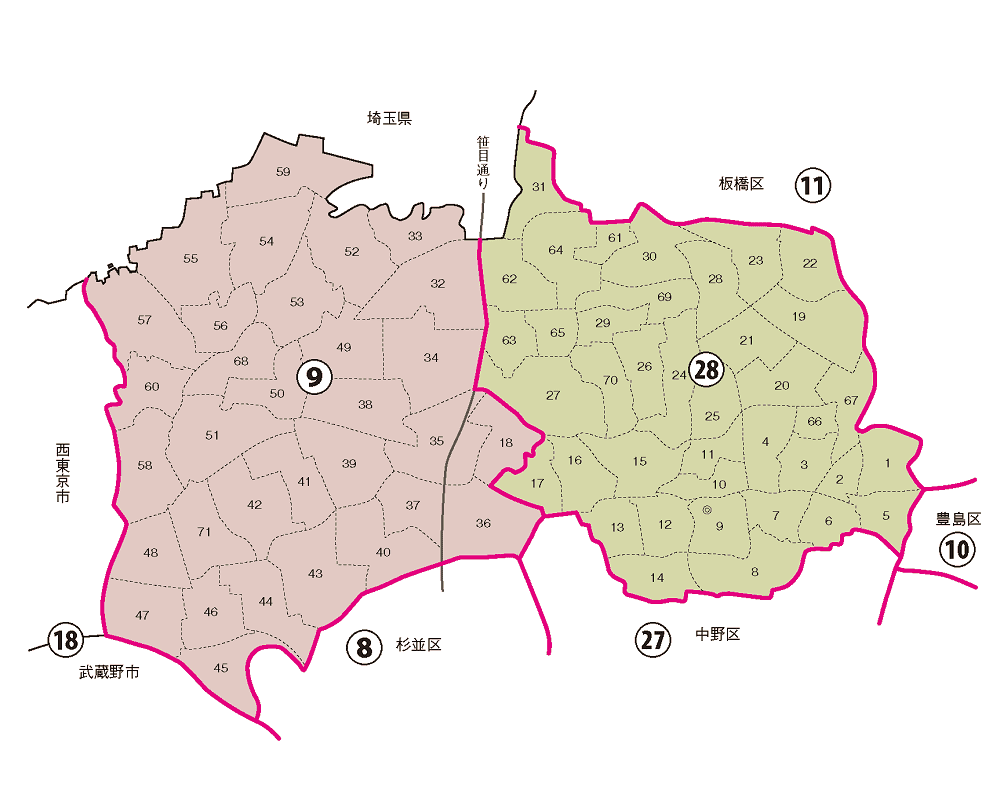 第9区に属しない区域(以下の地域) 旭丘1丁目、旭丘2丁目、小竹町1丁目、小竹町2丁目、栄町、羽沢1丁目~3丁目、豊玉上1丁目、豊玉上2丁目、 豊玉中1丁目~4丁目、豊玉南1丁目~3丁目、豊玉北1丁目~6丁目、中村1丁目~3丁目、中村南1丁目~3丁目、 中村北1丁目~4丁目、桜台1丁目~6丁目、練馬1丁目~4丁目、向山1丁目~4丁目、貫井1丁目~3丁目、 貫井4丁目(28 番、29 番4号、29番8号から29 番22 号まで、30 番9号、30 番10 号、44 番から46 番まで、47 番18 号から47 番48 号まで、47 番50 号から47 番52 号までを除く。)、貫井5丁目、 錦1丁目、錦2丁目、氷川台1丁目~4丁目、平和台1丁目~4丁目、早宮1丁目~4丁目、春日町1丁目~6丁目、 高松1丁目~5丁目、北町1丁目~8丁目、田柄1丁目~5丁目、光が丘1丁目~7丁目、旭町1丁目~3丁目、 富士見台3丁目(20 番6号から20 番10 号まで、38 番から46 番まで、47 番5号から47 番7号まで、 55 番6号から55 番17 号まで、56 番から63 番までを除く。)、 谷原1丁目 |