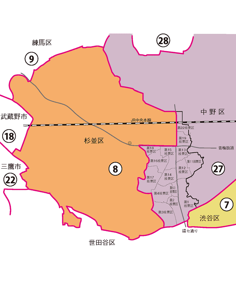 第8区に属しない区域(以下の地域) 方南1丁目、方南2丁目、和泉1丁目~4丁目、永福1丁目(1番)、和田1丁目~3丁目、堀ノ内1丁目~3丁目、 松ノ木1丁目~3丁目、大宮1丁目、大宮2丁目(1番から4番まで、19 番から27 番まで)、梅里1丁目、梅里2丁目、 高円寺南1丁目、高円寺南5丁目、高円寺北1丁目 |